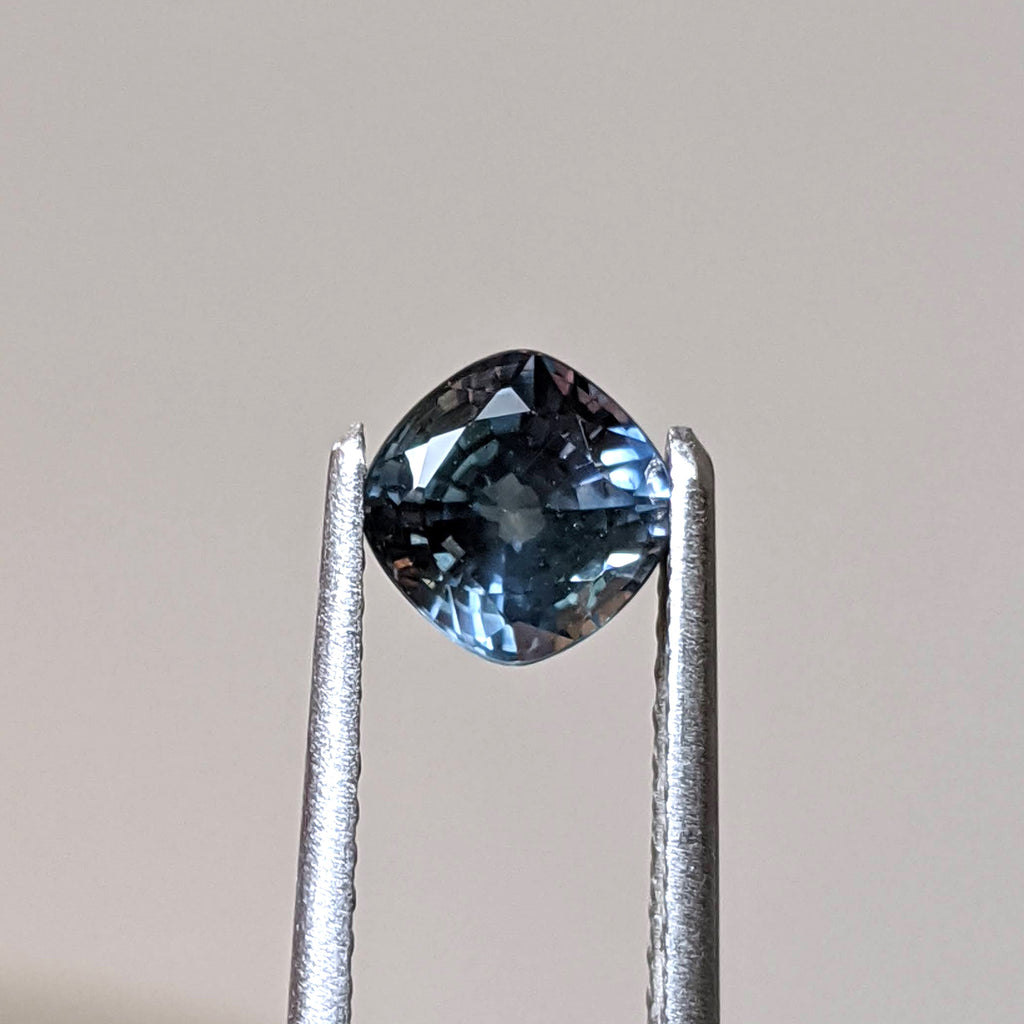 Ethically sourced, 5.64mm-5.61mm x 3.92mm cushion cut, peacock sapphire, weighing 1.08ct.  This unusual gem has hints of greens, yellows and purples.