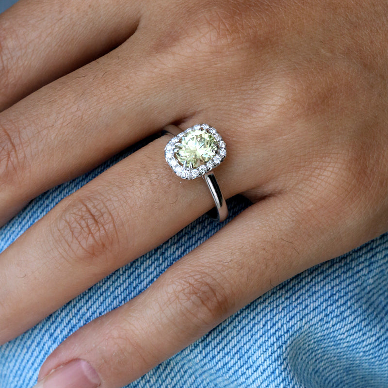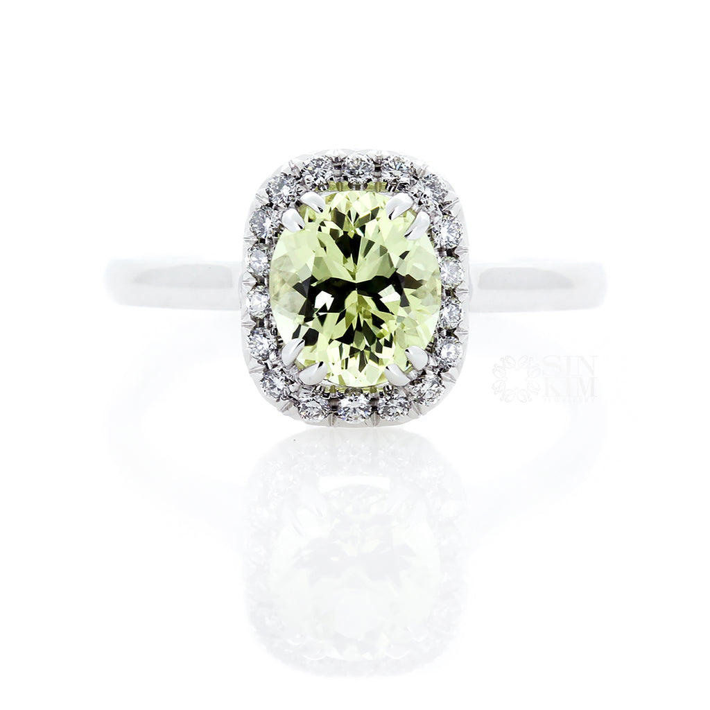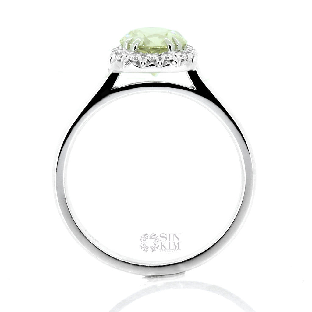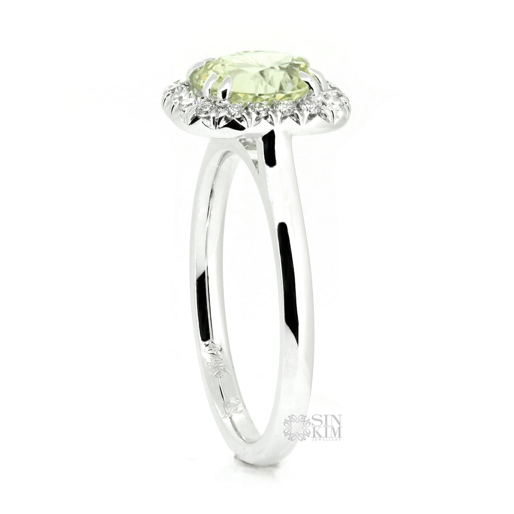 Ethically sourced, 1.65ct Sri Lankan Oval Chrysoberyl, set in a 14k white gold, cushion shape, diamond halo, on plain plain band.  Total weight of the diamonds is 0.19ct.  They are VS/SI quality, F/G colour, Very Good cut.