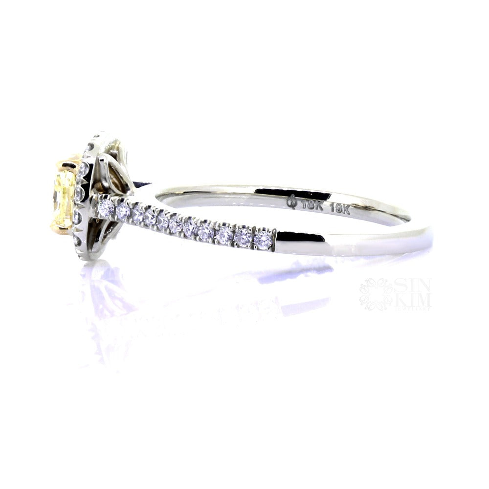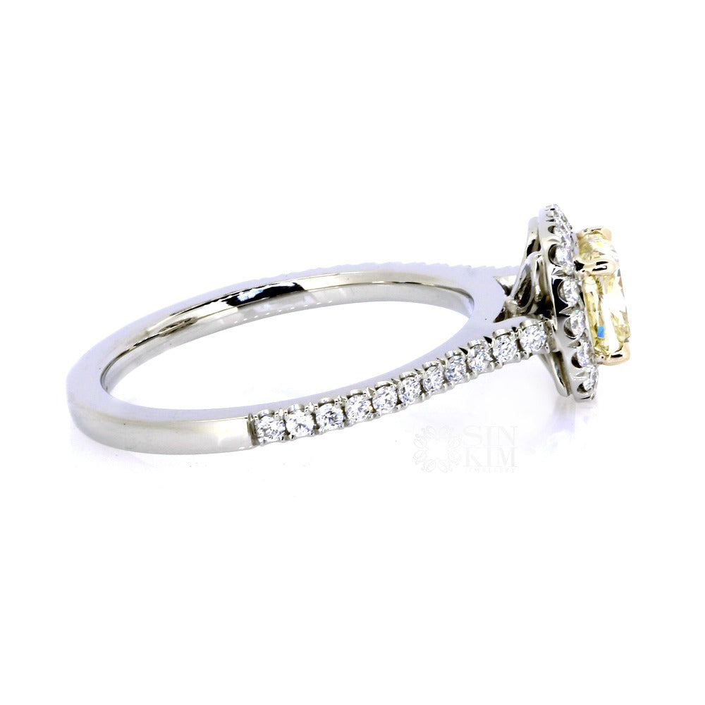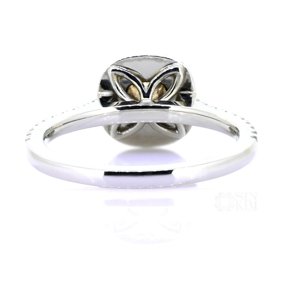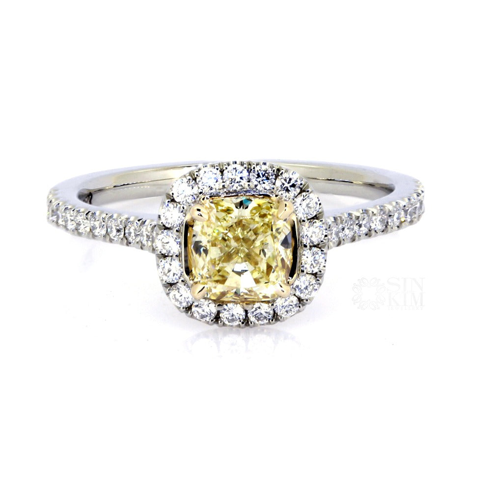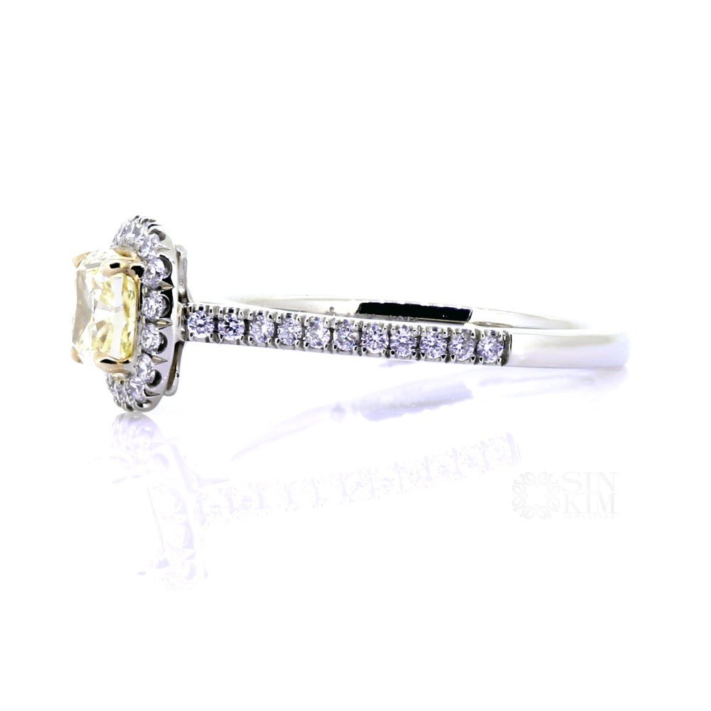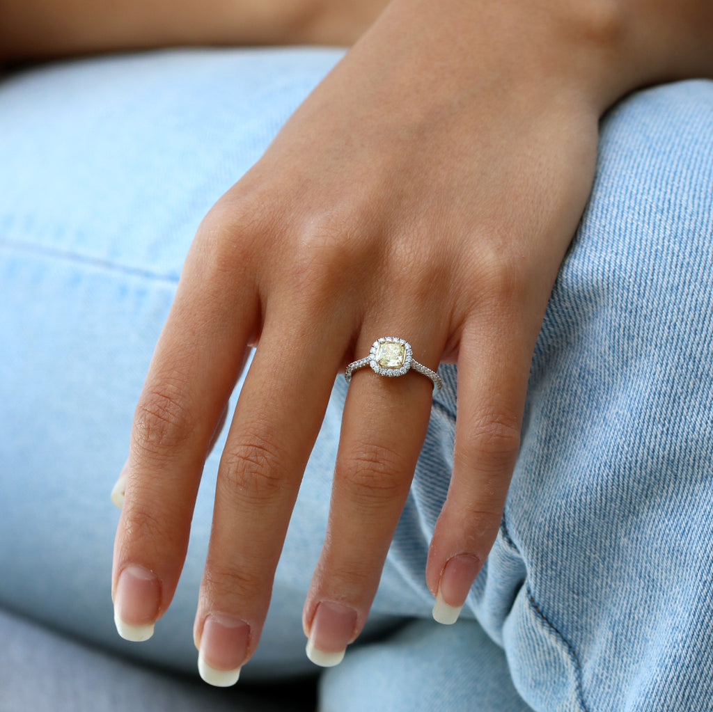 The in stock ready to wear Juliette ring houses a GIA certified 0.80ct, Y-Z colour, VVS2, cushion cut diamond set in 18K yellow gold four claw setting and enclosed basket, with estimated 0.35ct total weight of small diamonds set in the 19k white gold halo and paved diamond band. Quality of small stones F-G, VS-SI, Very Good-Good.