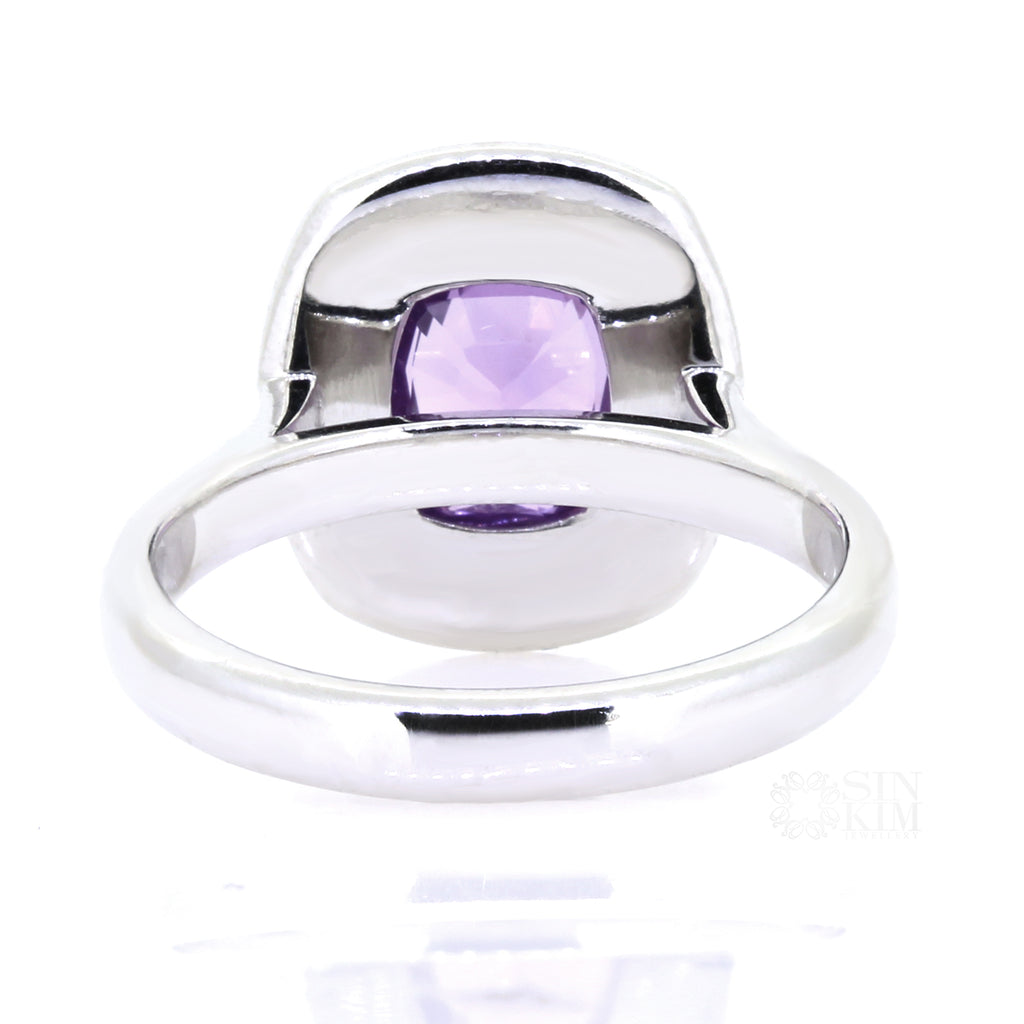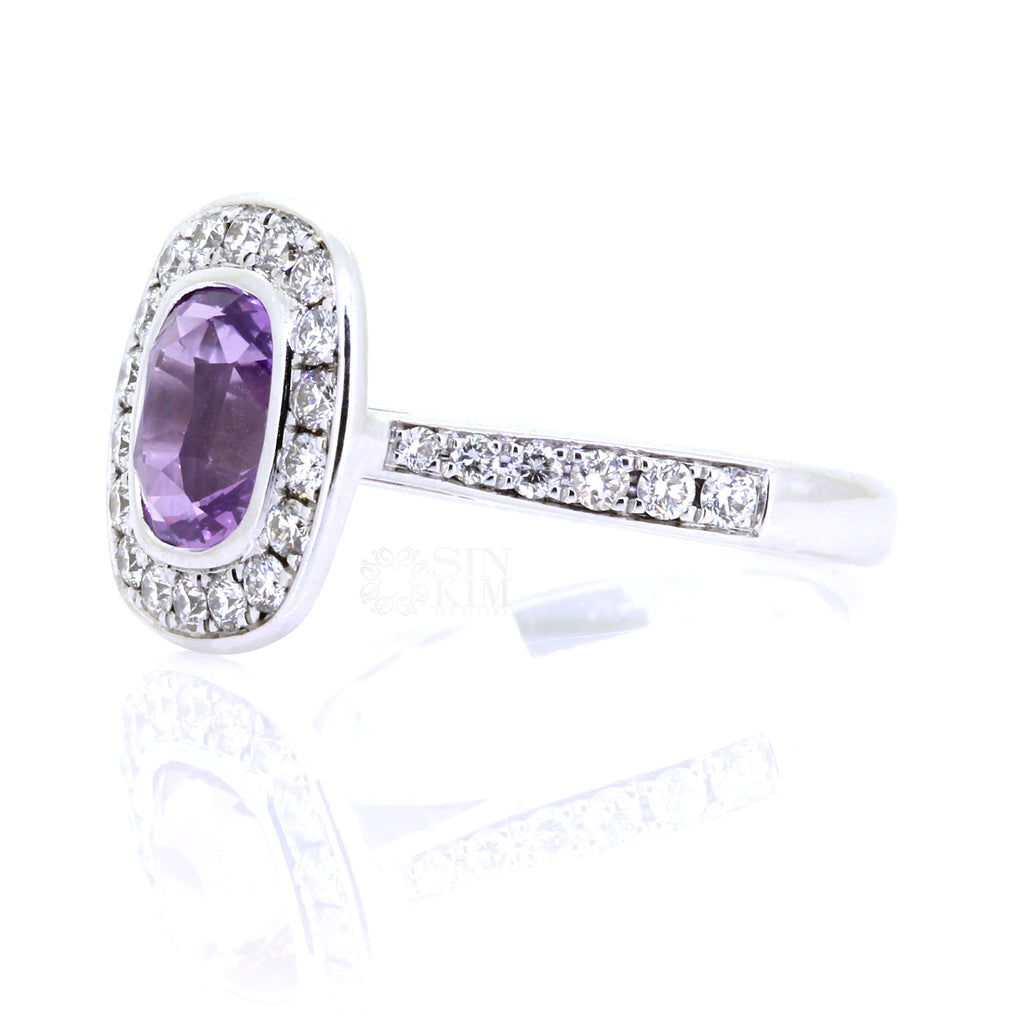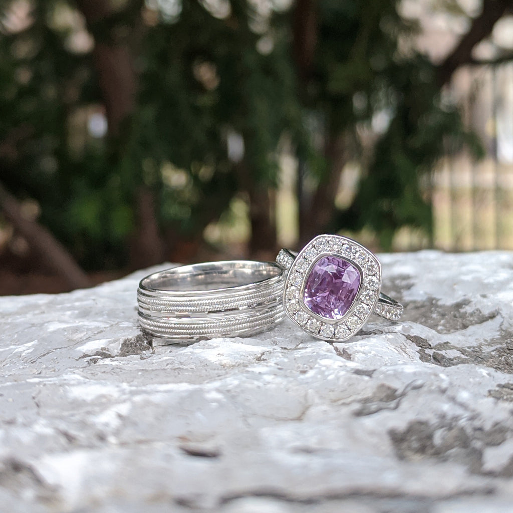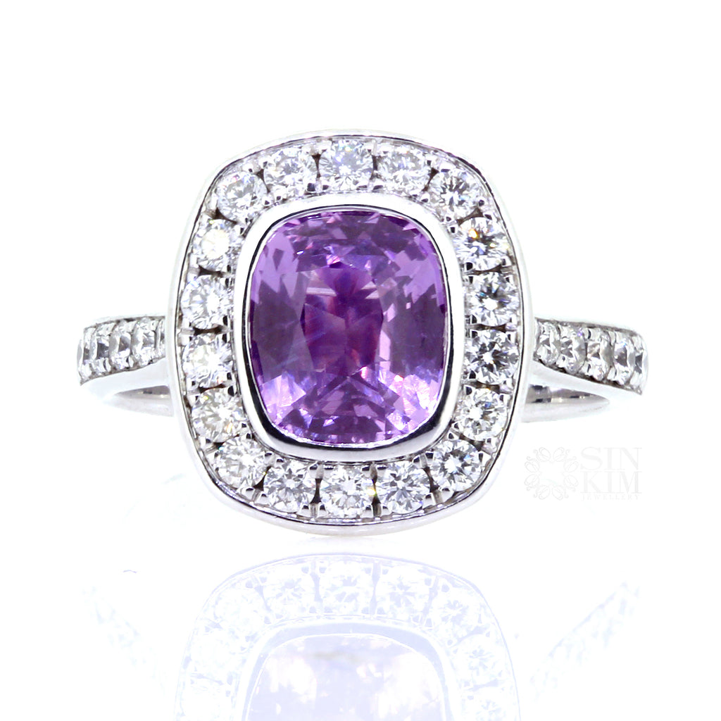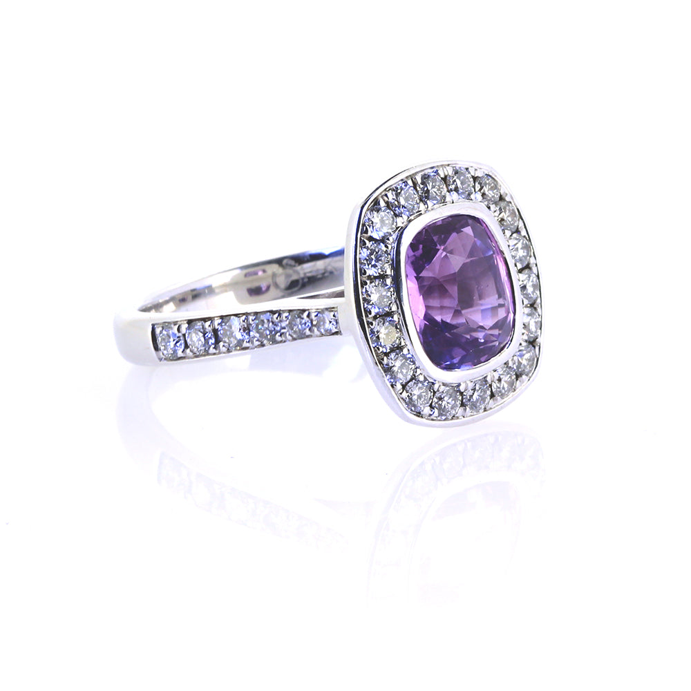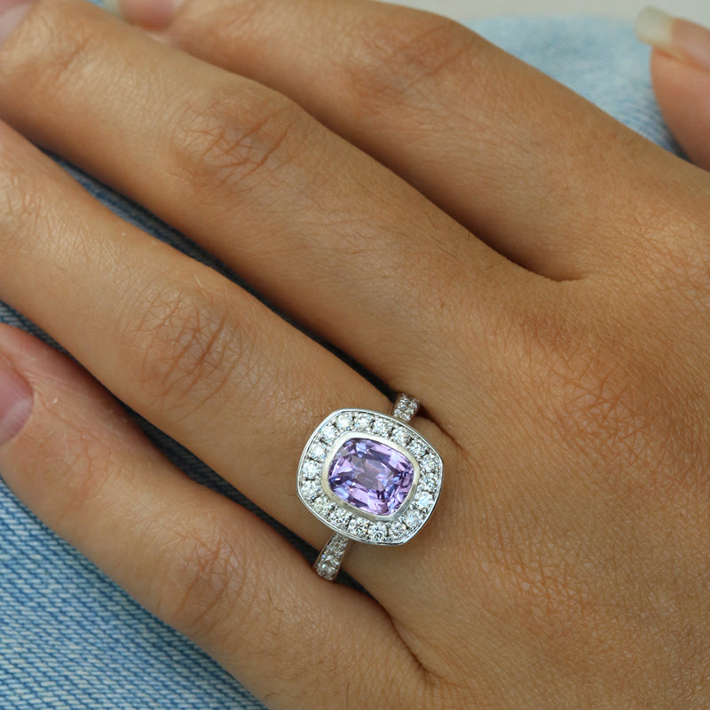 The ring we currently have in inventory has a 2.16ct bezel set light purple sapphire cushion, set in 14k white gold with an estimated 0.66ct total F/G, VS/SI, G-VG diamonds set in the halo and down the band.