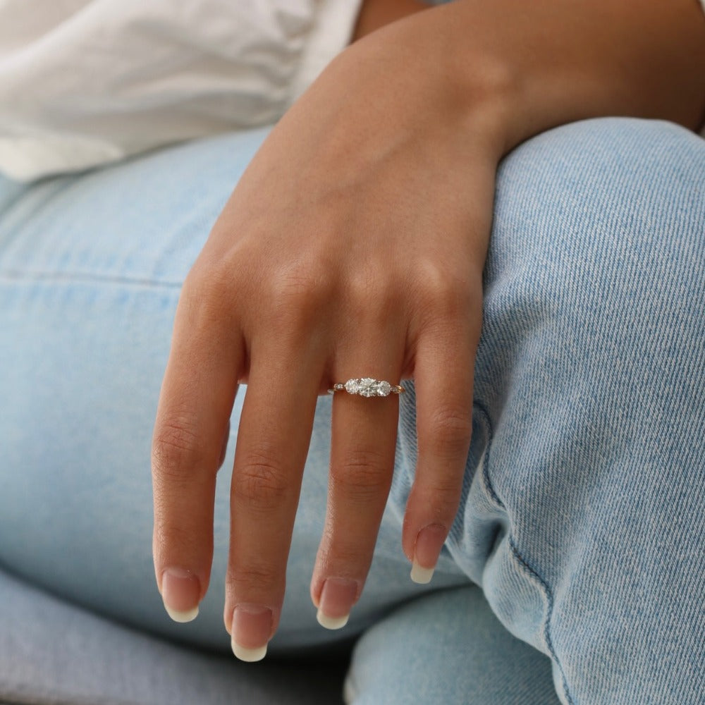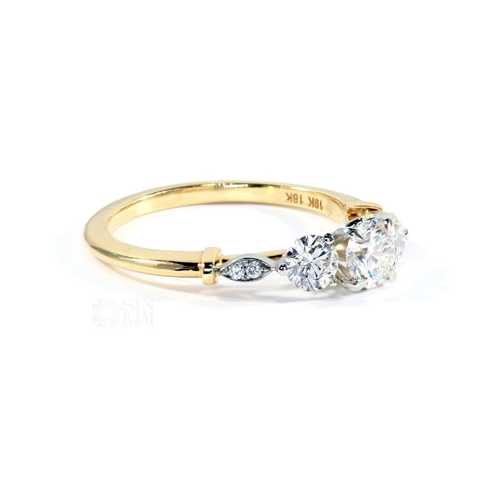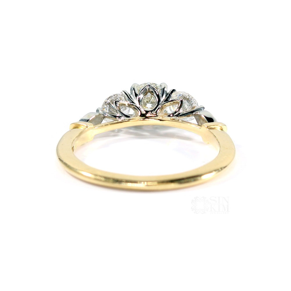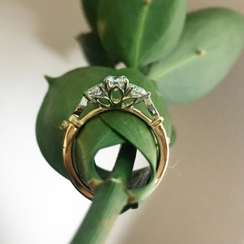 Vintage inspired, two toned, engagement ring.  Three stone, trinity setting, with paved leaf accents.