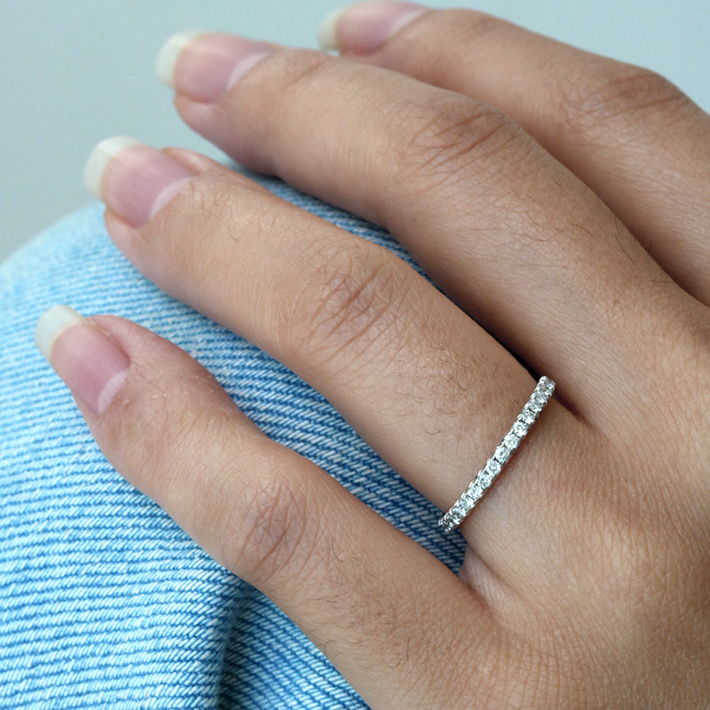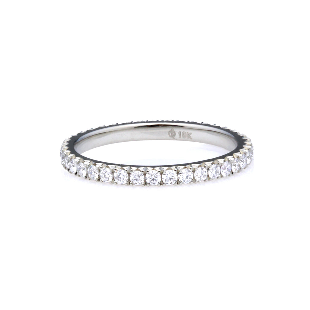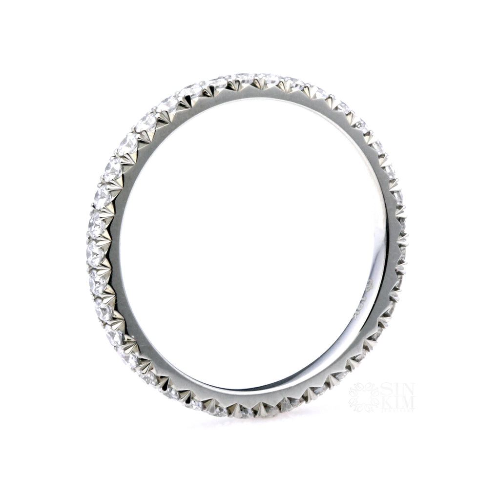 This exquisite, hand set, diamond band, is our shiniest!  The french cut pavé sparkles from every angle.   You will be mesmerised as the light dances off each meticulously hand engraved setting.  This ring dainty and elegant ring packs a lot of fire!  Looks great worn alone or in a stack.  Consider it for a wonderful classic wedding band or anniversary gift.