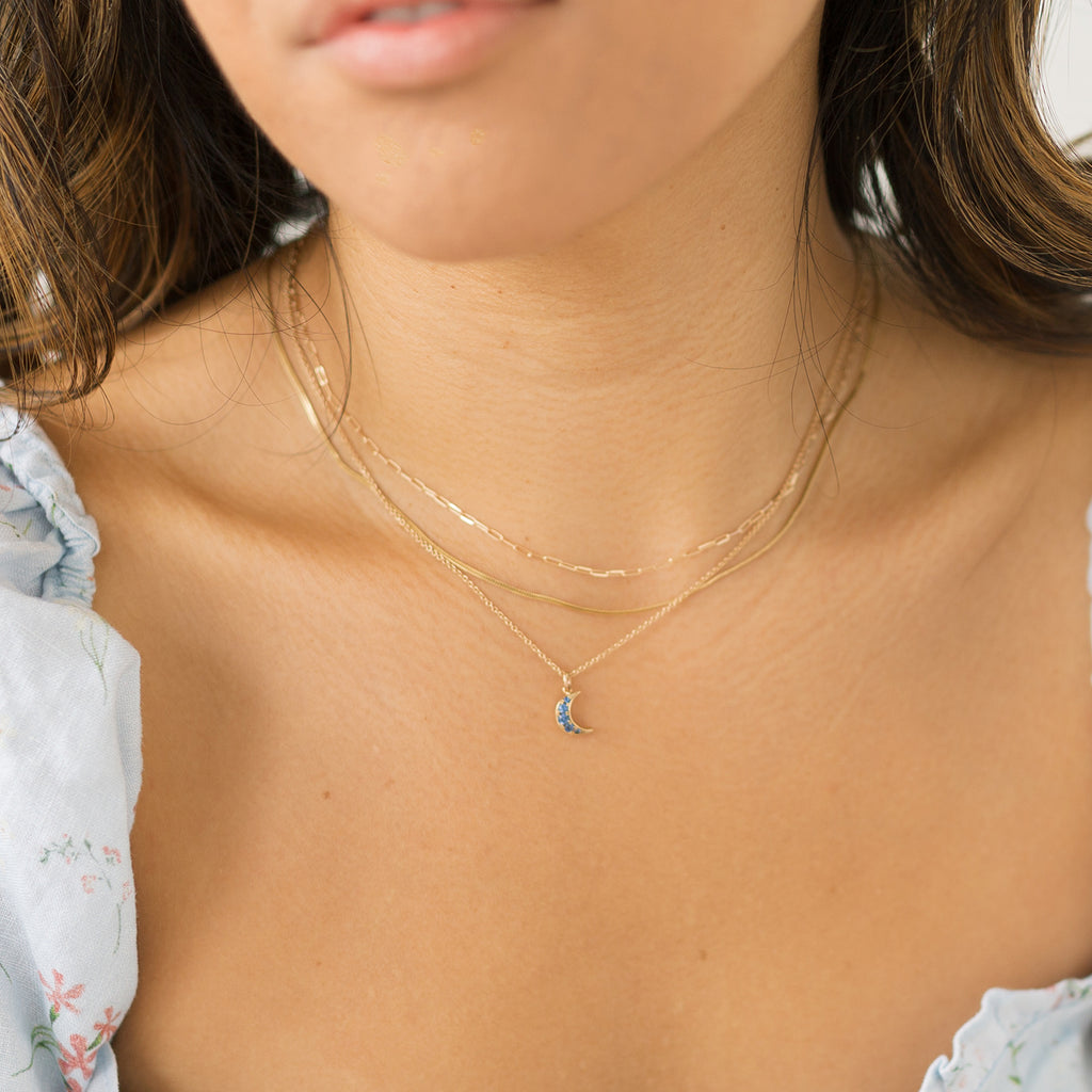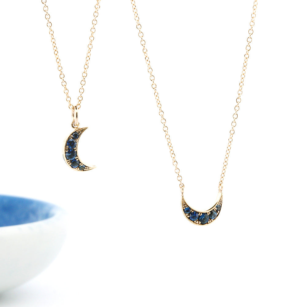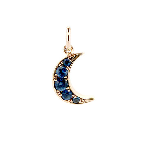 Solid 14K Yellow Gold Moon Pendant set with five blue sapphire gems.  The moon measures approximately 9mm x 7mm.
