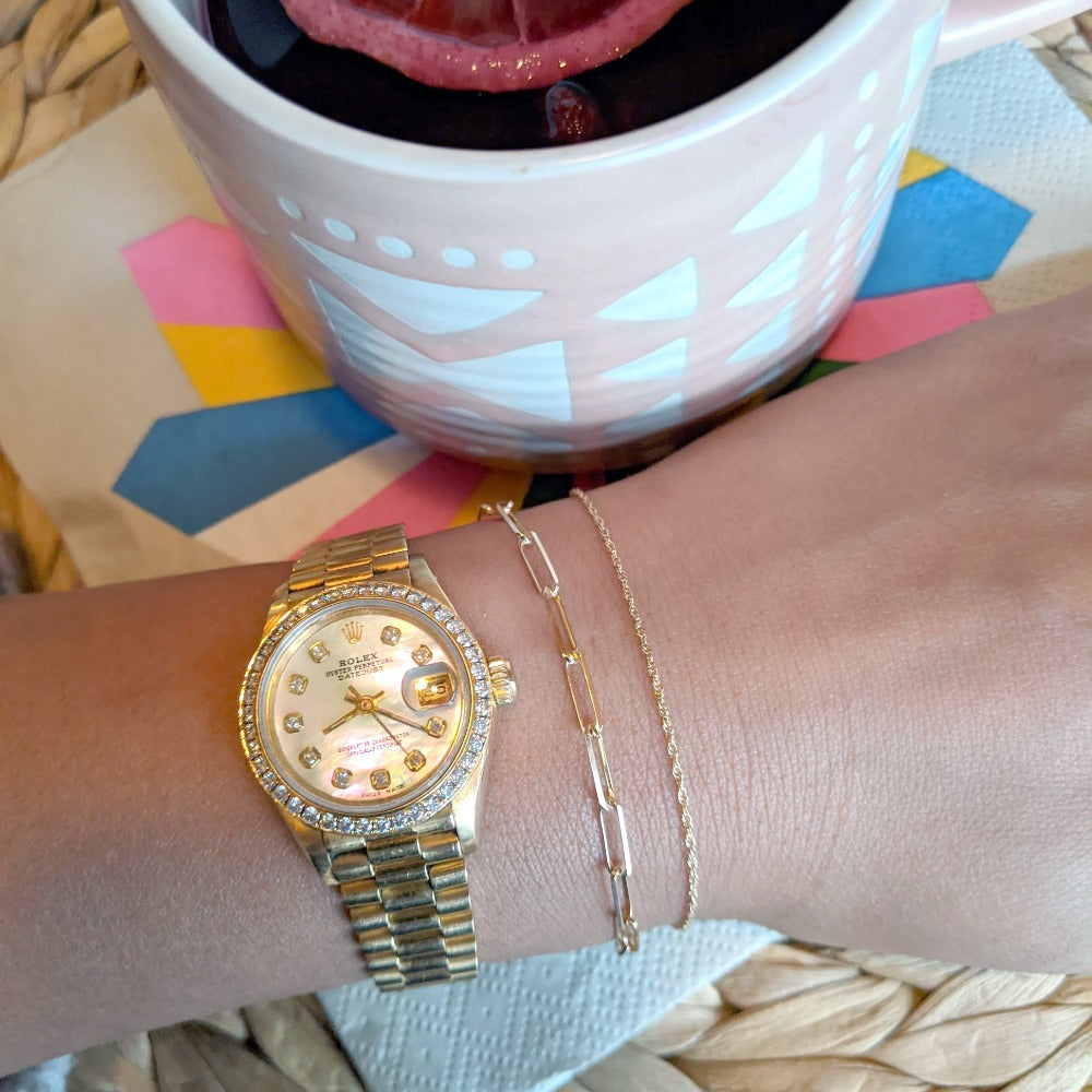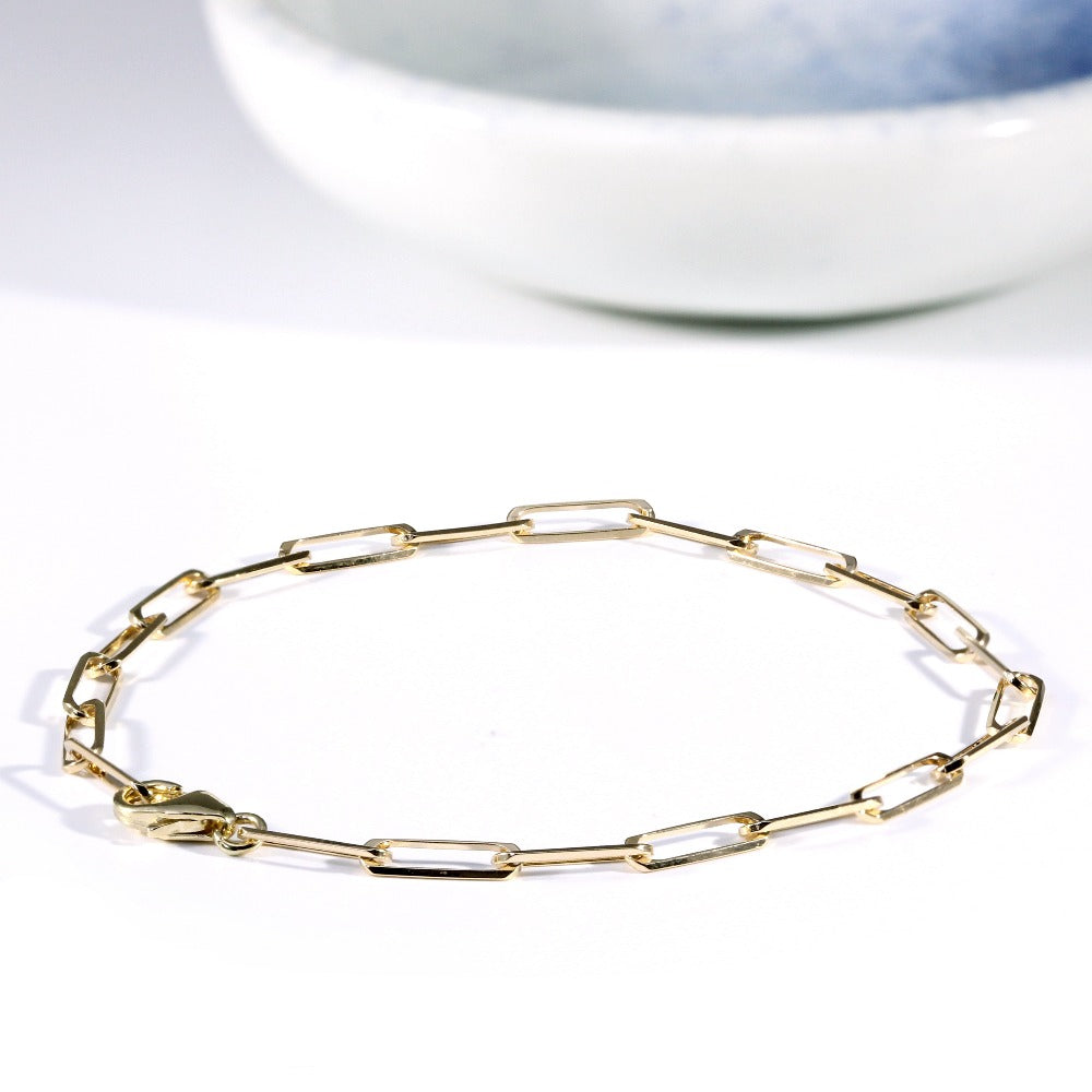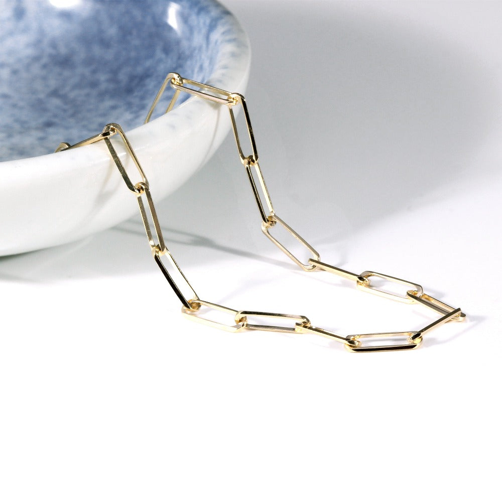 Solid gold, open rectangular link paperclip chain.  It is light weight, diamond cut, 3mm wide, with lobster clasp.
