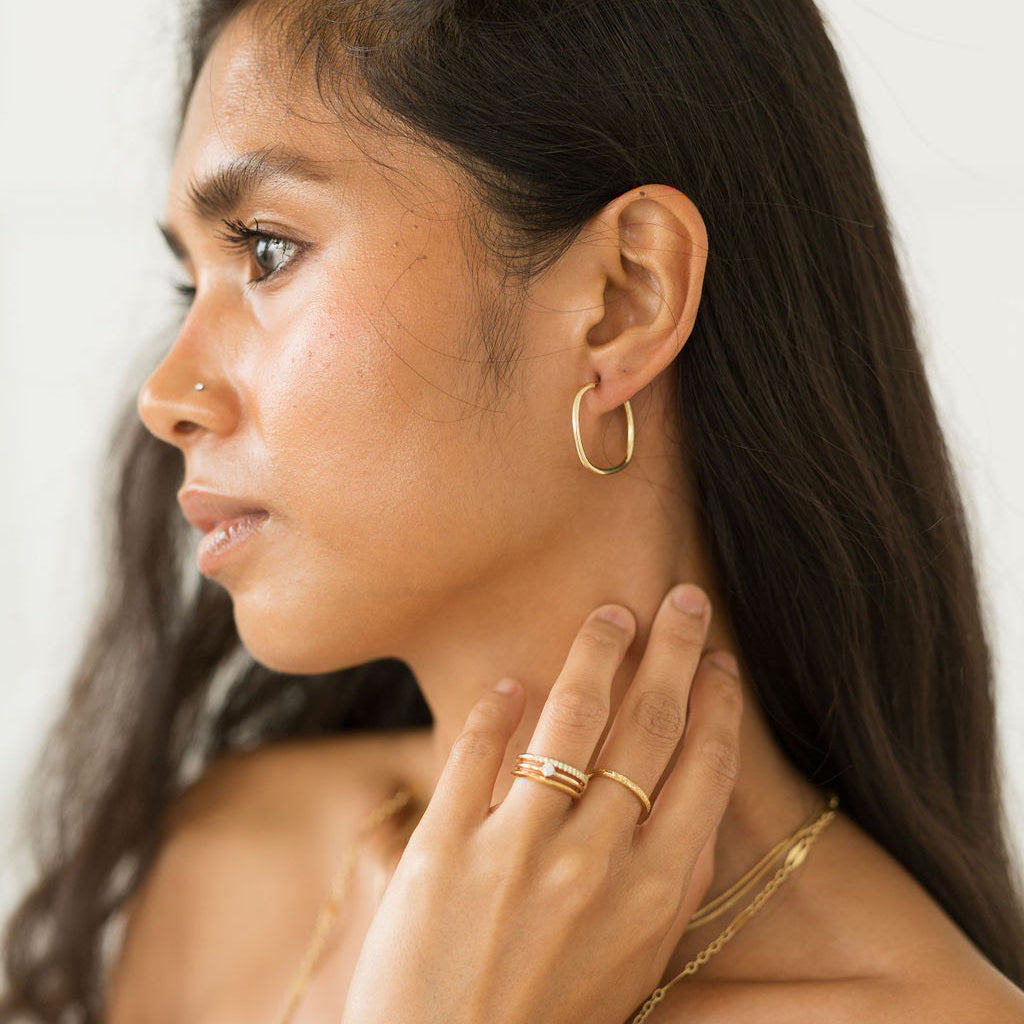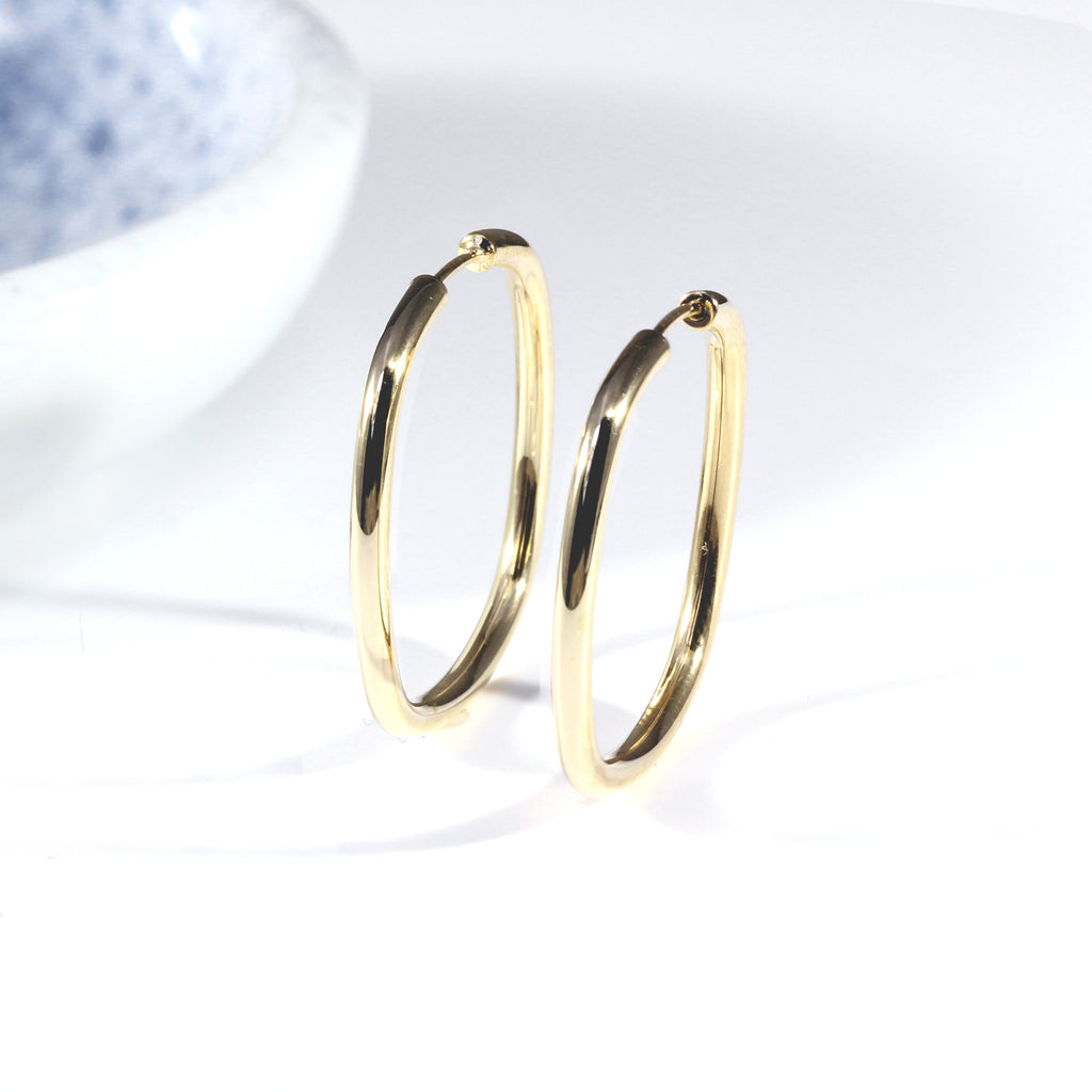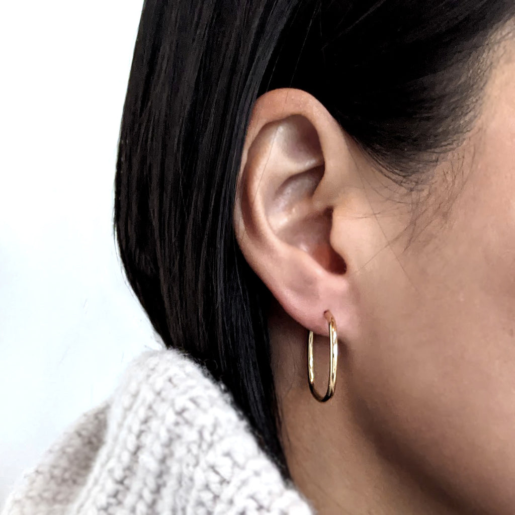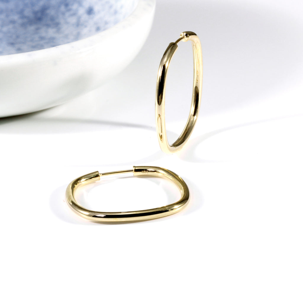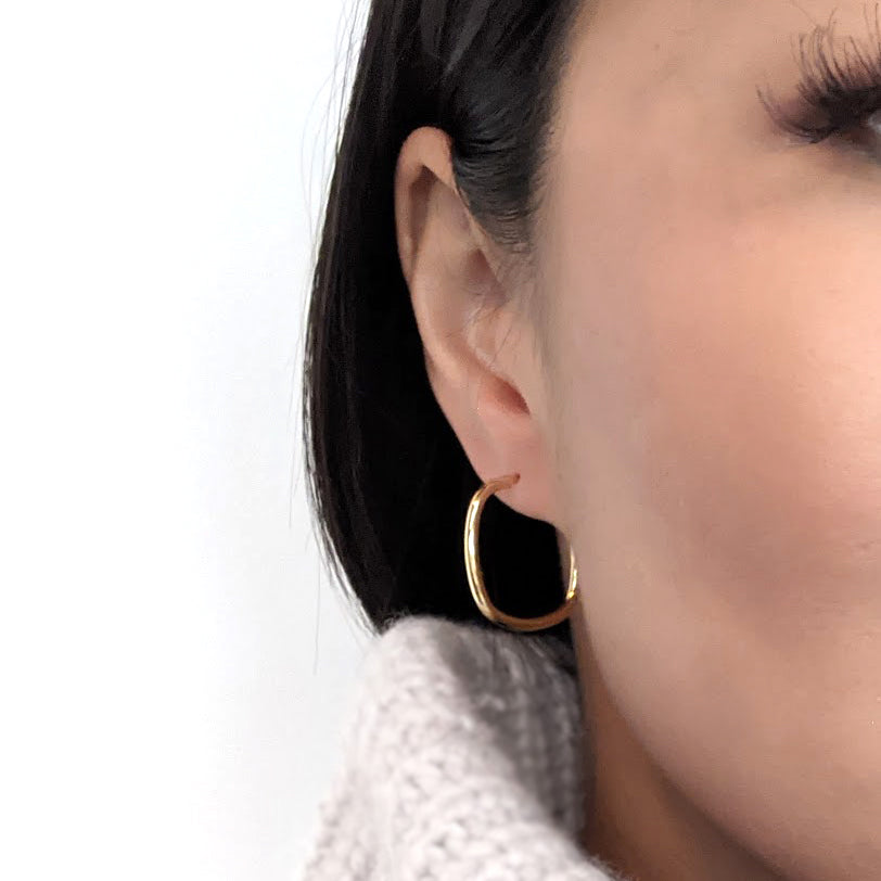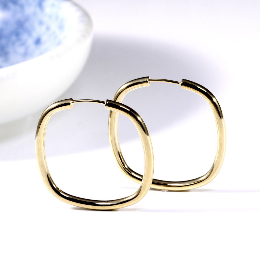 Modern and minimal, tempered, 14K yellow gold, light weight, soft square, hoop earrings.