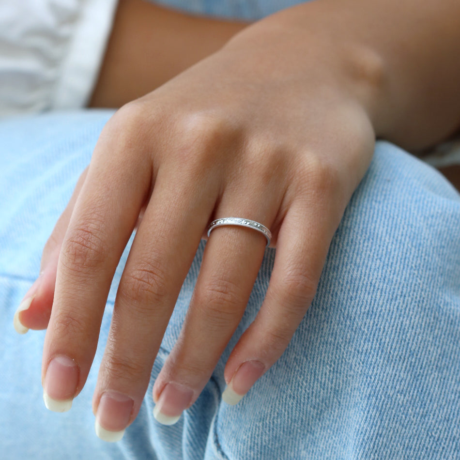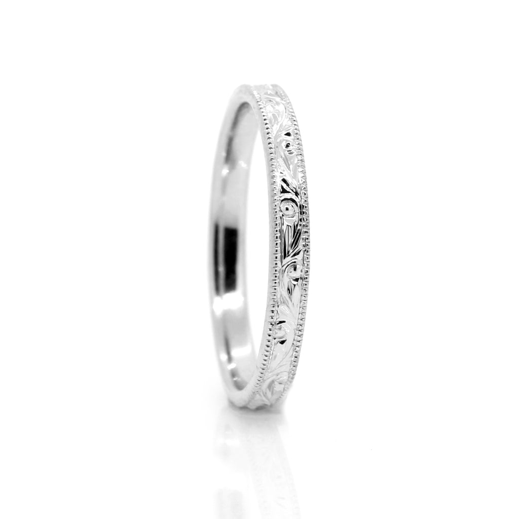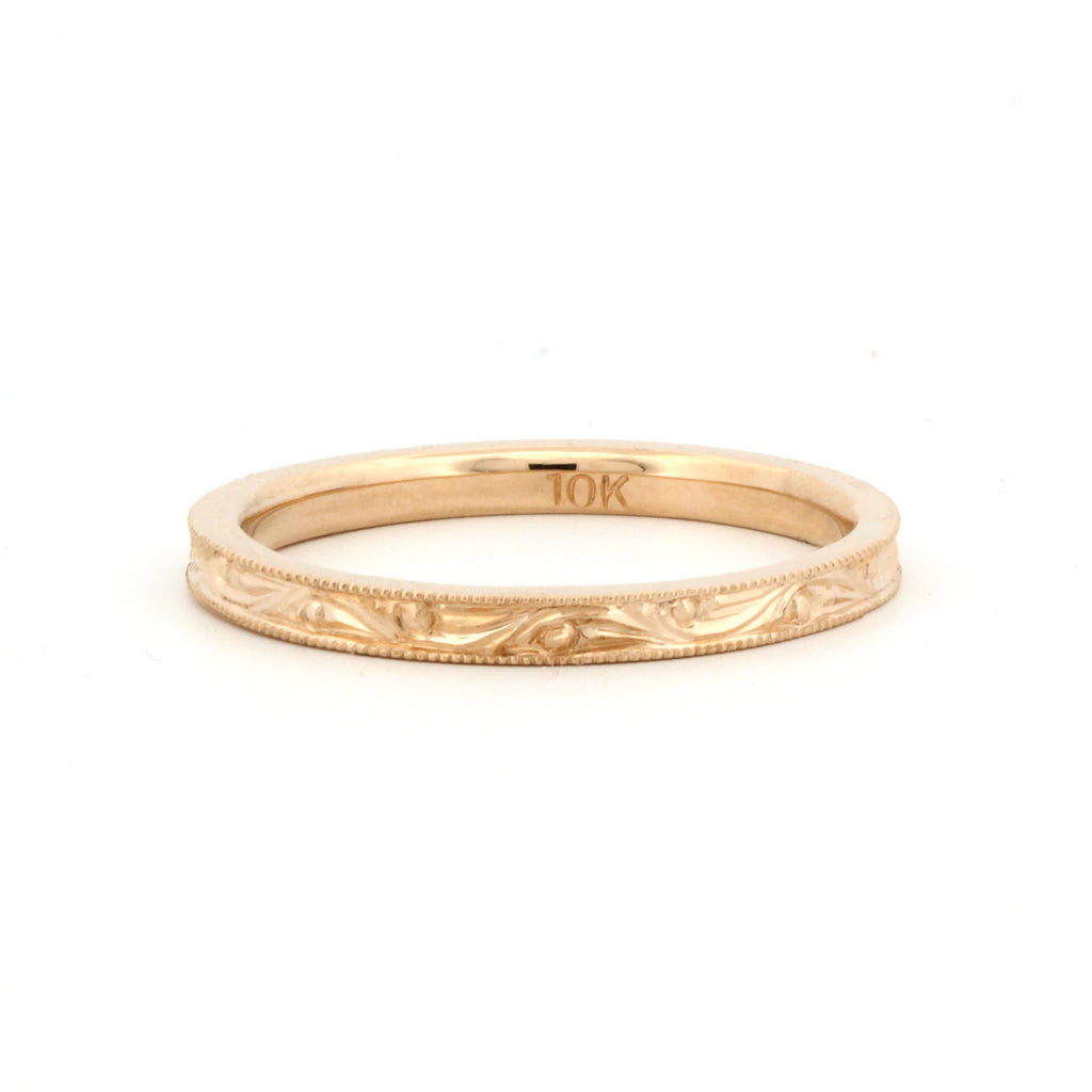 The Winnie Band is a 2mm wide, flat top ring.  The hand engraved leaf and scroll pattern and milgrain along the edge, adds an interest texture and shine giving this ring a sweet vintage feel.  It would make a great wedding band option or everyday stacking ring.