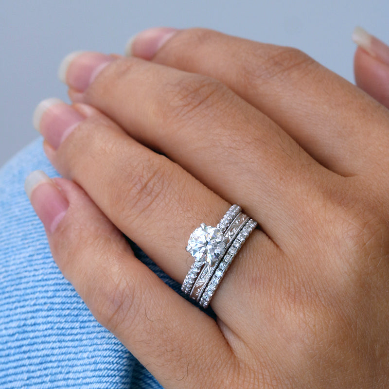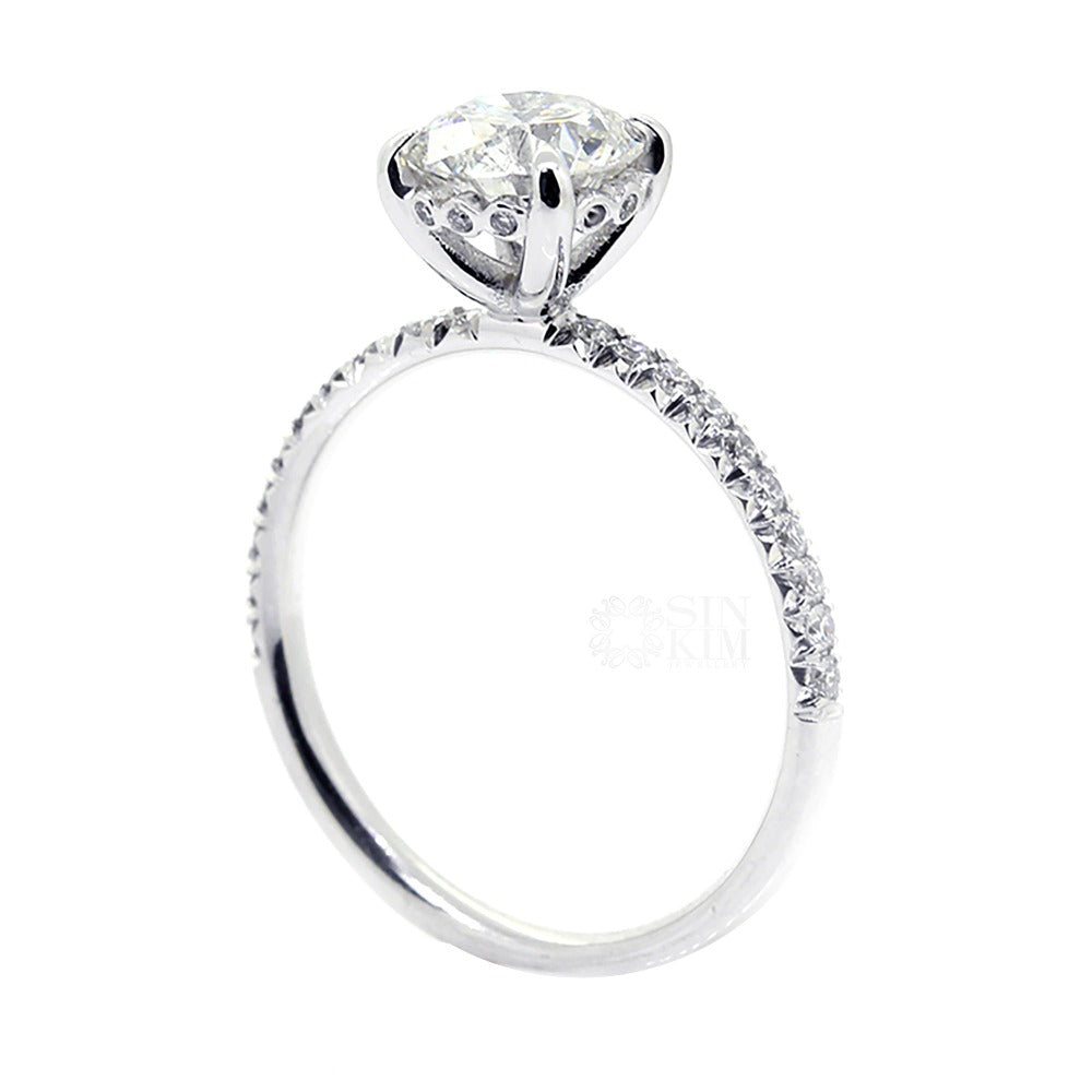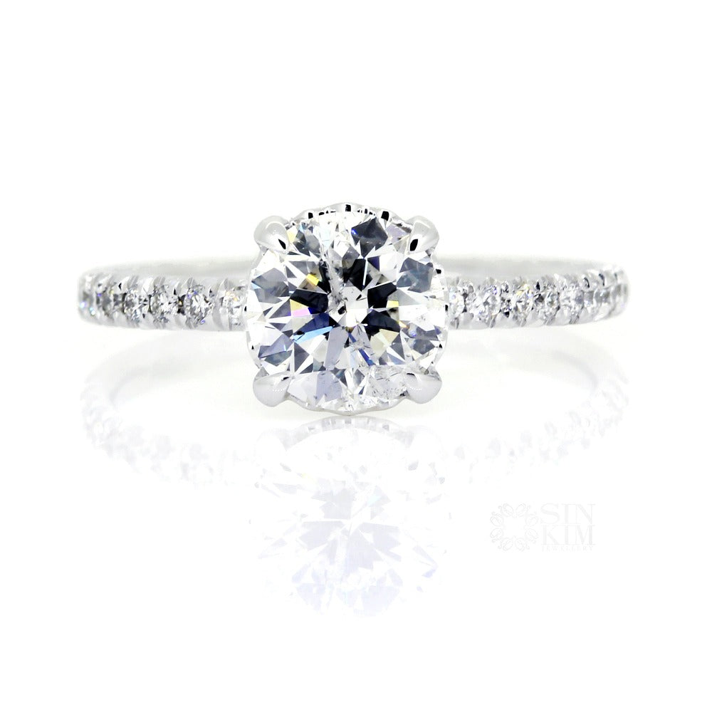 This ring really allows the 1ct, F colour, I1, round brilliant cut diamond centre stone to shine!  Set in a simple 18K four claw setting with a small string of diamonds add a bit of sparkle to the undergallery and an estimated 0.25ct total diamonds set on the undergallery and band.