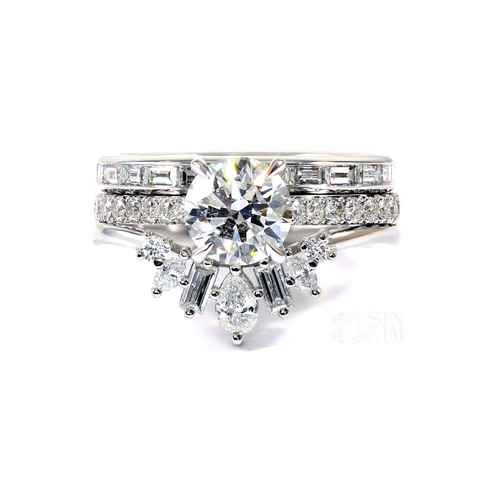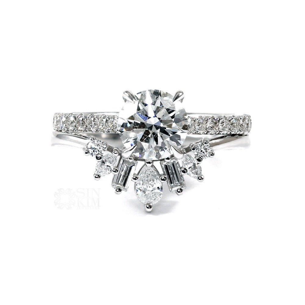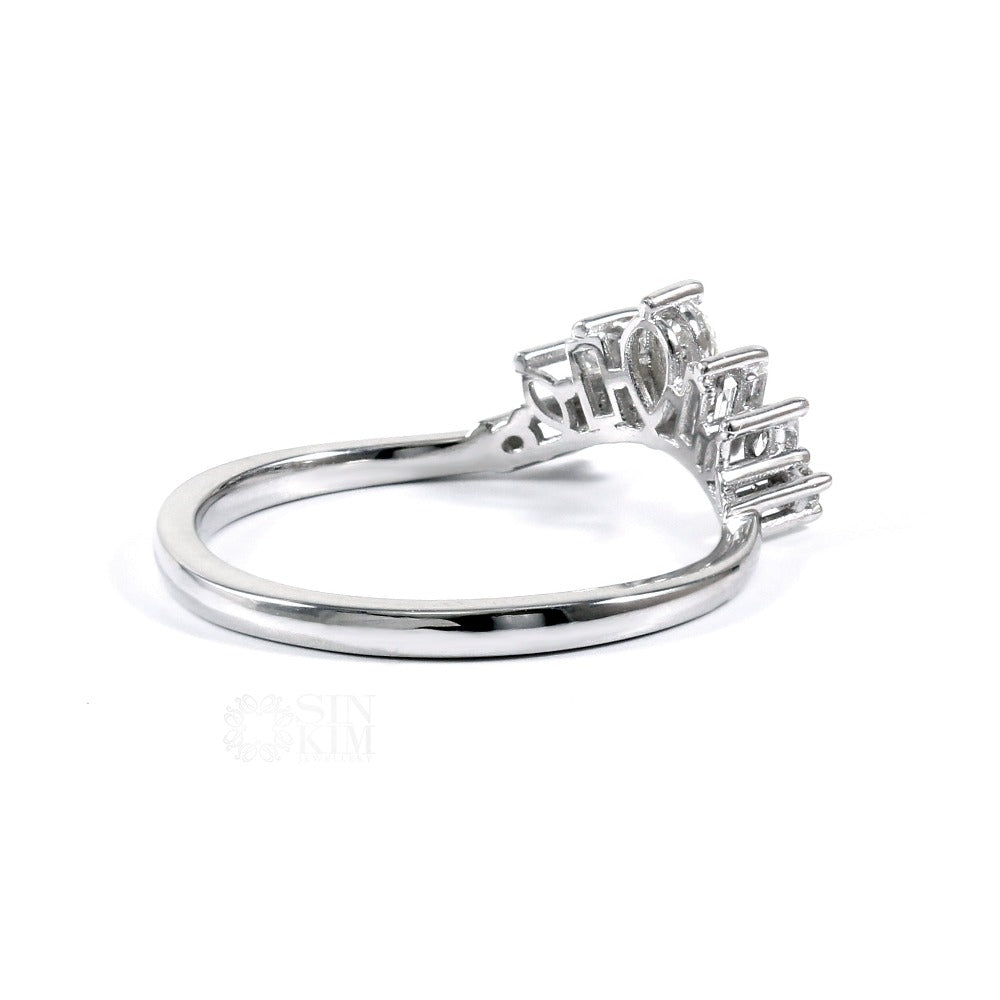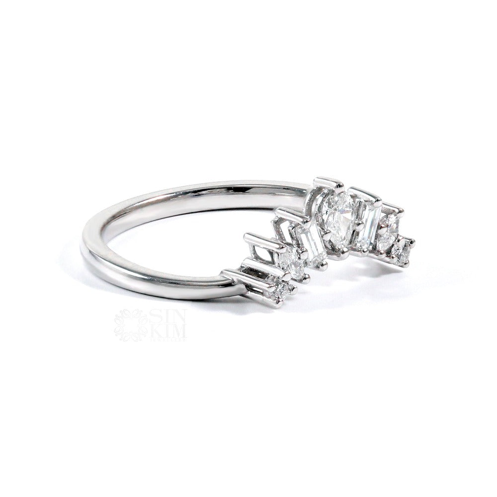 Round, marquise, baguette and pear shaped diamonds set in claws along curved wedding band in a patterned array.