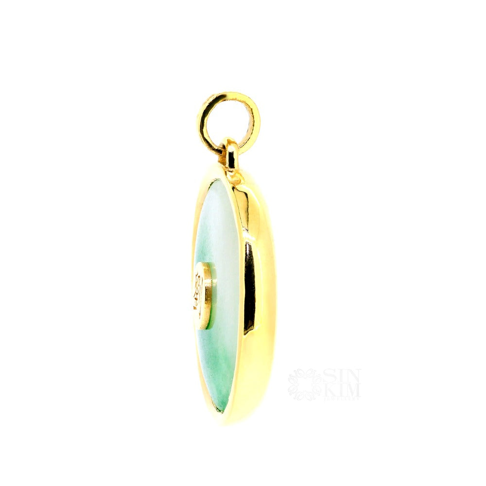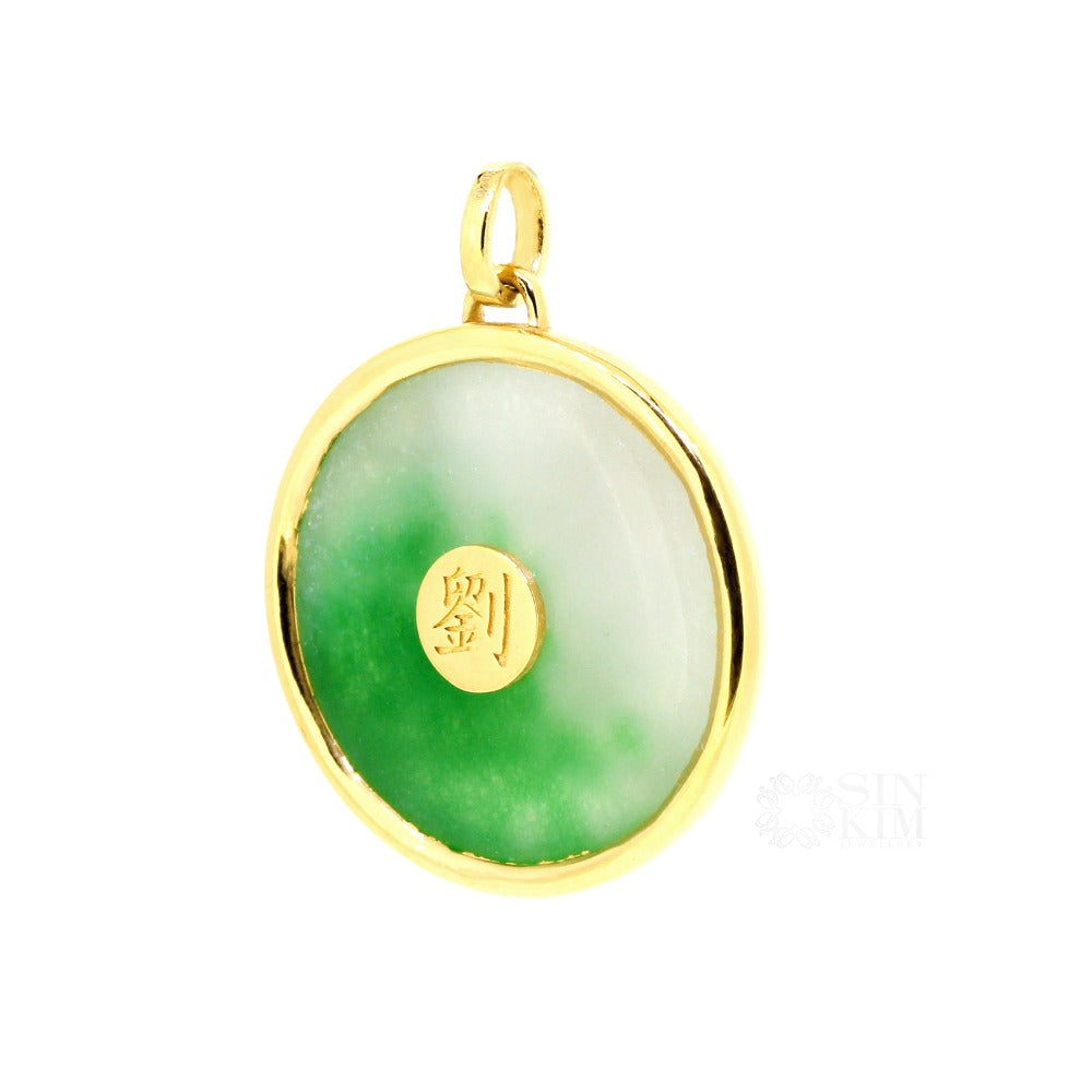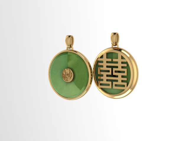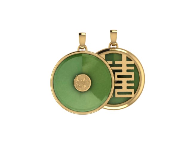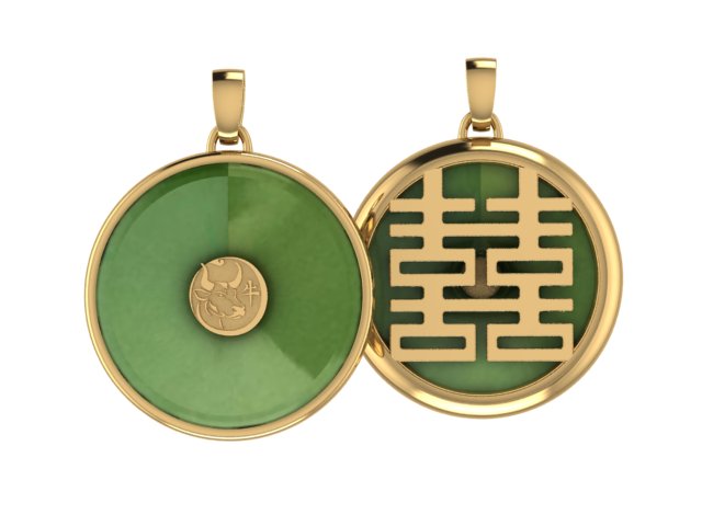 25mm round Canadian Nephrite Jade Bi Disc bezel set in yellow gold with Chinese characters/symbol for double happiness on back and small custom face plate in front.