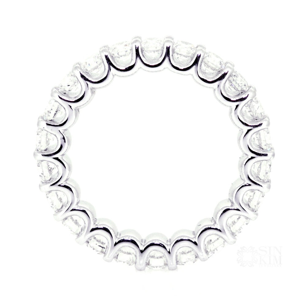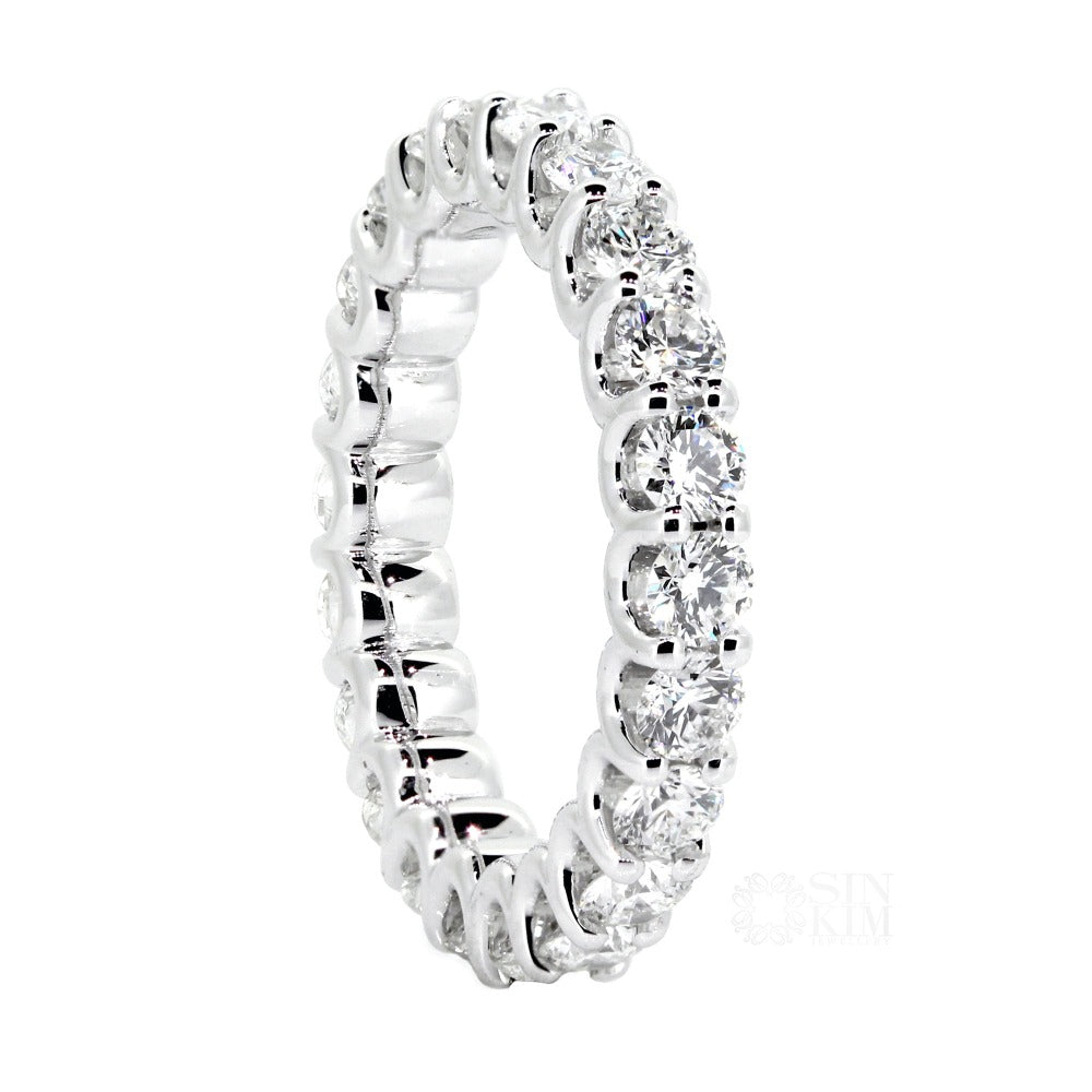 Classic 3mm round diamond eternity band, with open scalloping details along the side of ring.  The total diamond carat weight of this ring is around 2ct-2.6ct depending on ring size.