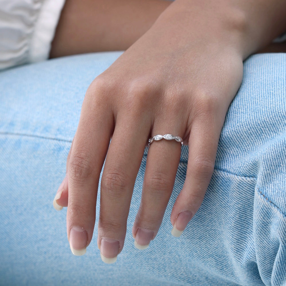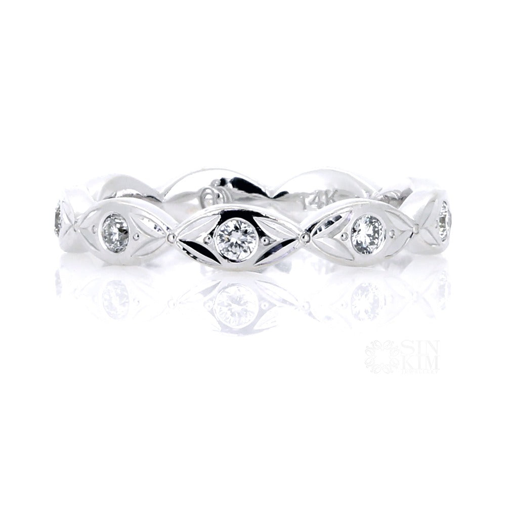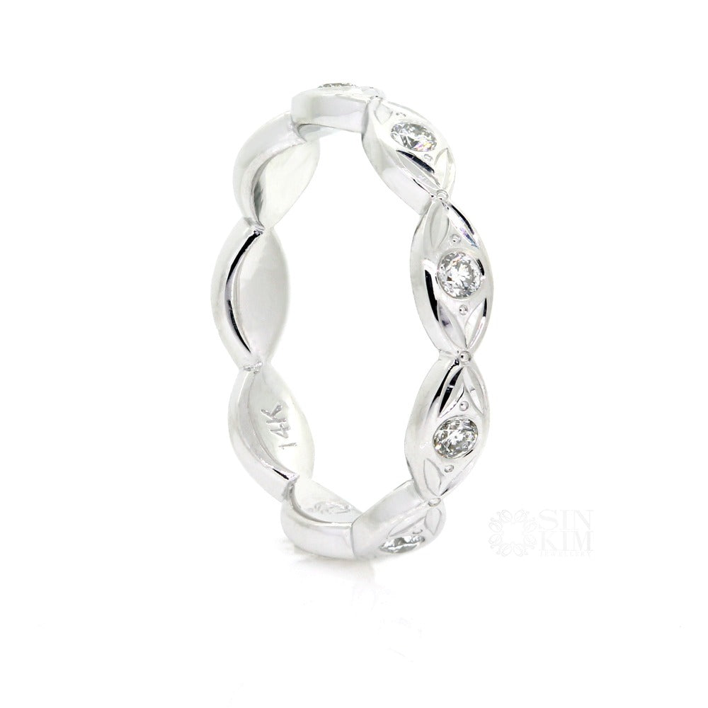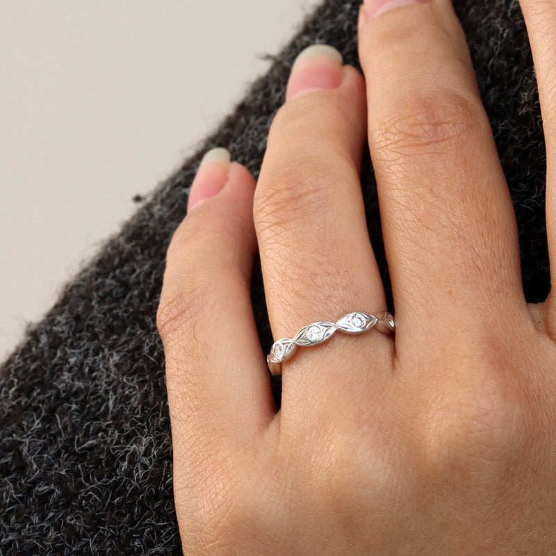 The Mariposa is a beautiful, whimsical wedding ring, or gift to self.  It is a lovely 14k white gold leaf patterned ring, set with one round diamond in each petal and small butterfly wings between.  Total carat weight of diamonds are an estimated 0.20ct total. They are G/H colour, VS/SI clarity and Good-V/G cut.
