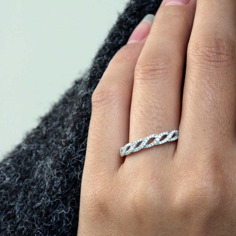 Open braid patterned ring, measuring 3.5mm wide on top, tapering to 2mm wide.
