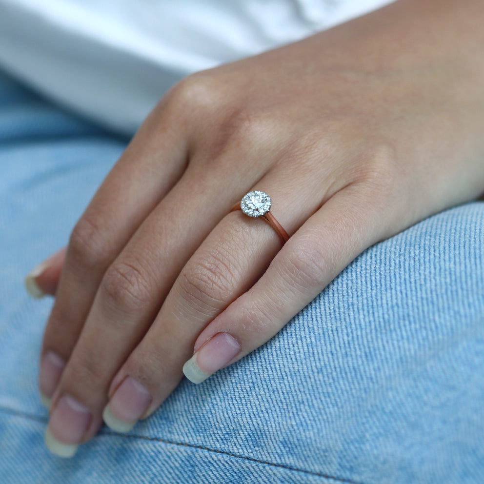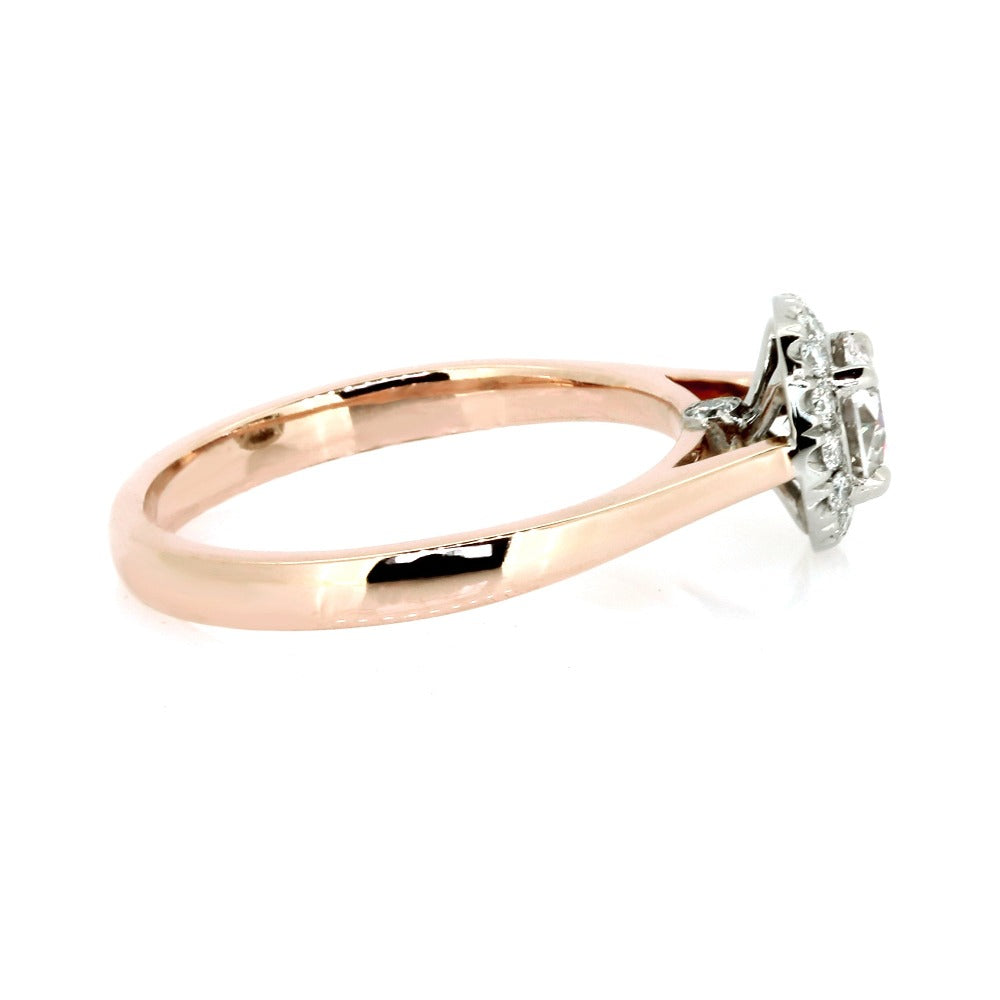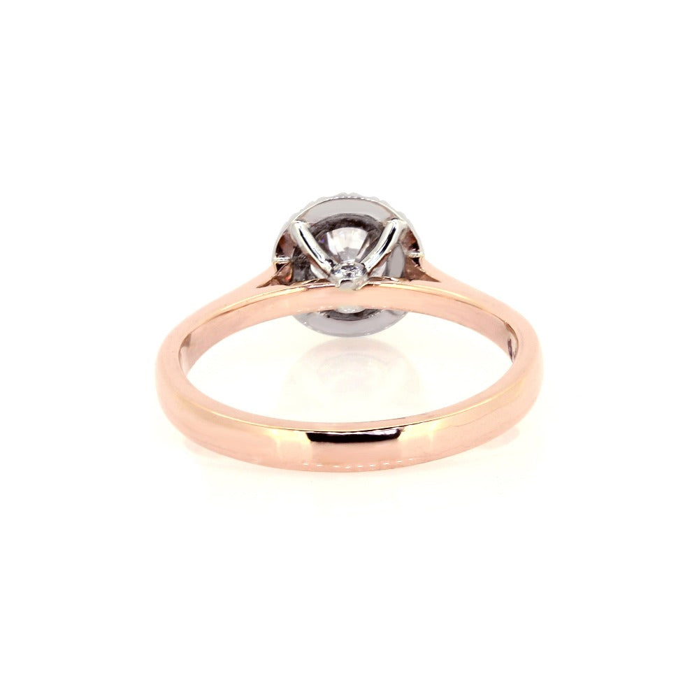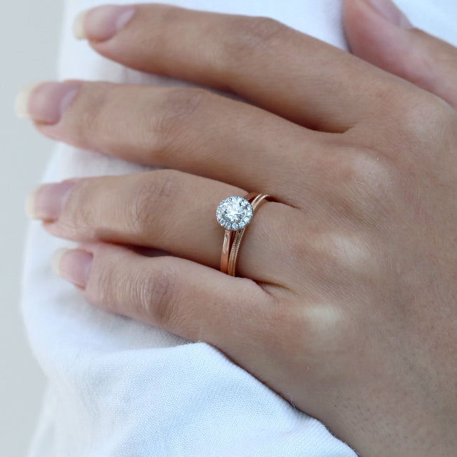 Two tone, Claw set round diamond ring with white gold halo and decoratived under-gallery and option of diamonds on band.