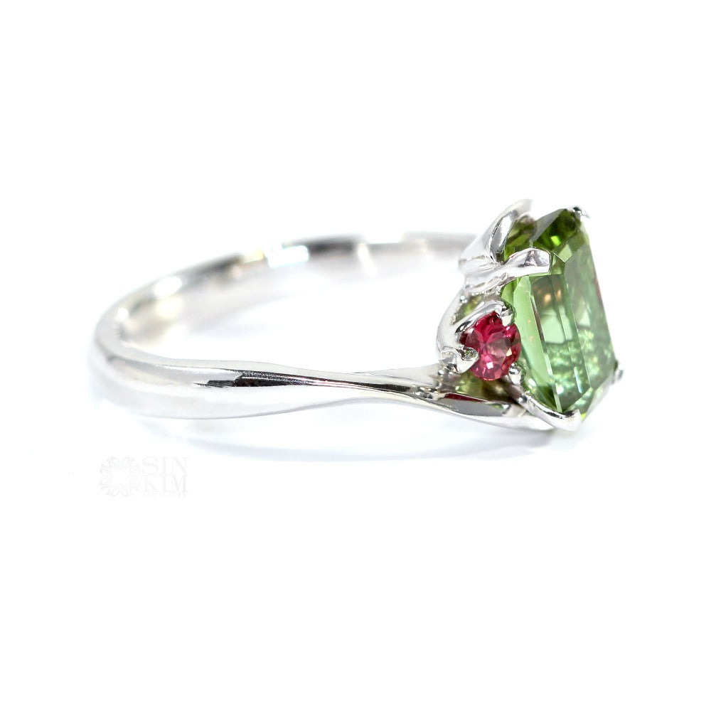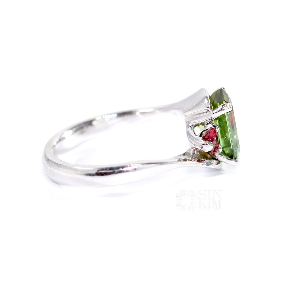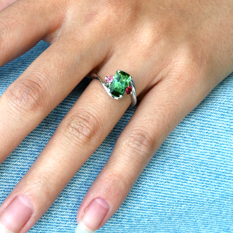 This 1.84ct octagonal cut, green tourmaline is bound to get noticed.  This mixed radiant cut gem was ethically sourced from Mozambique, and has been showcased next to two reddish orange sapphires to really let its colours show.